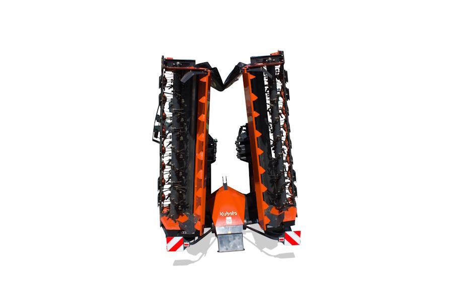 Even weight distribution on both rear tires of the tractor. Telescoping frame arm is moved to the lowest overlap position to reach transport height. Outer side guard available with hydraulic folding mechanism. Sure-footed, integrated parking food for vertical storage requiring minimum space for storage.